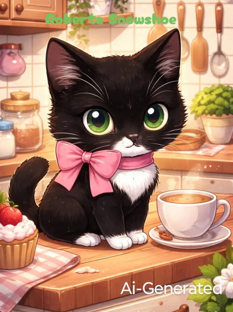 ( As Roberta exits the living room with a regalness, another cat alert emerges from behind the furniture cautiously and carefully. With a compact built body and eyes of gold this female black cat mirrors a miniature panther. She pauses to survey the room).
